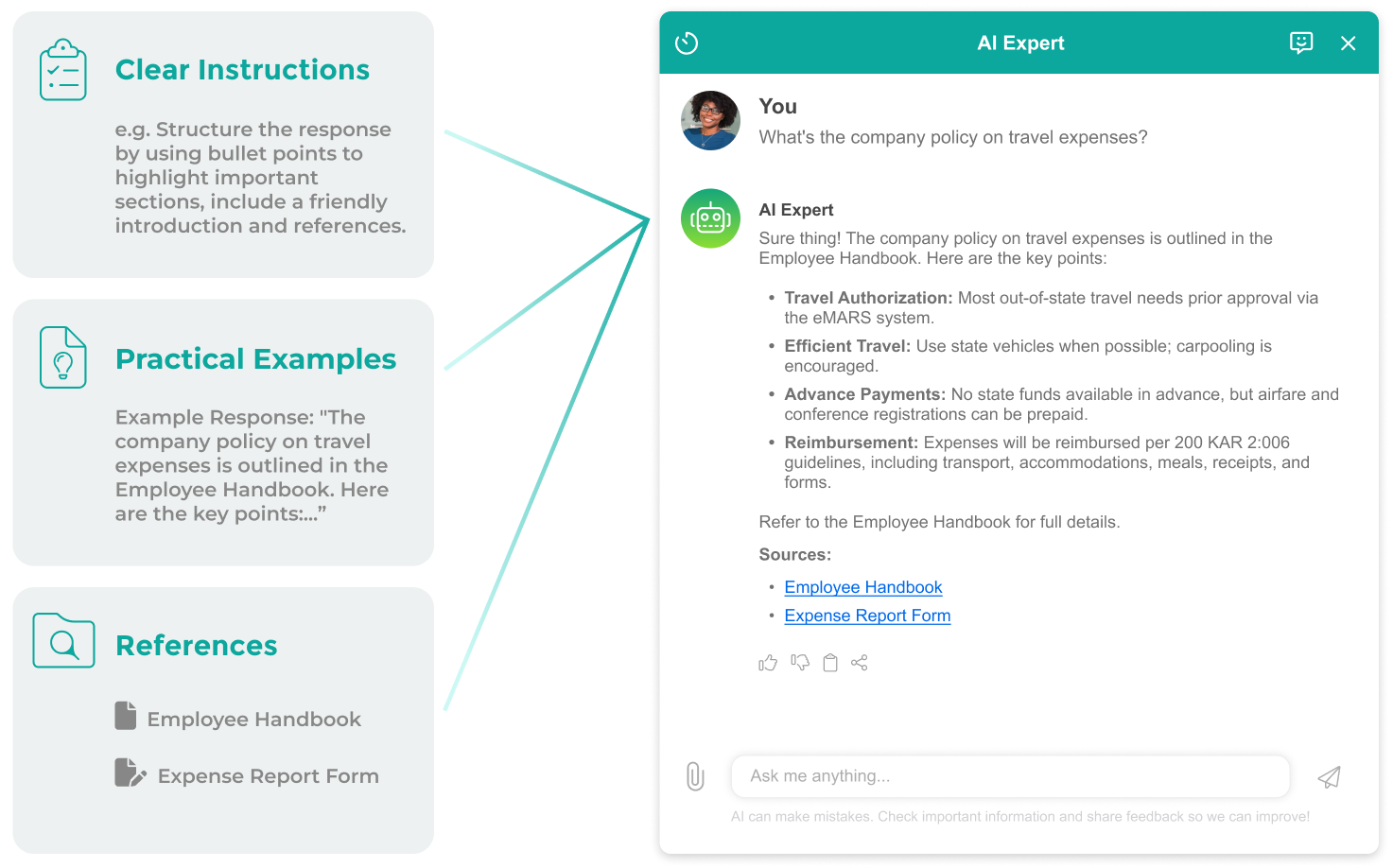 - Provide Clear Instructions and References:Providing clear instructions on how the AI should use documents or sections of documents ensures better accuracy. Specific references, such as directing the AI to “refer to Section 4 of the Office Resource Guide,” help maintain the accuracy of responses.