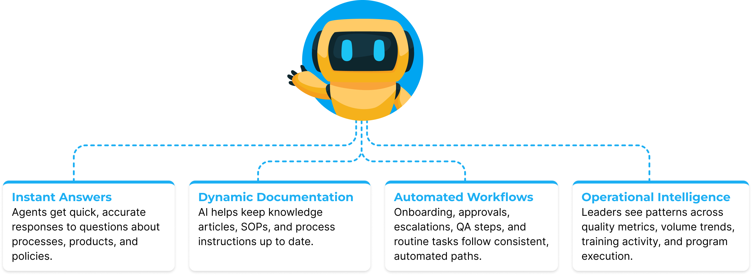 AI strengthens program performance by keeping knowledge, processes, and updates accurate and accessible for every agent, no matter where they work.