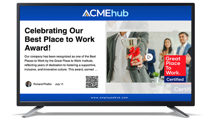 Elevate your organization’s communication efficiency across multiple platforms for maximum impact in various settings, from retail stores to corporate offices. Display live updates and current intranet content that employees can view directly on their mobile devices by scanning a QR code shown on the display. Increase overall engagement by including Recognitions in your Digital Signage feed to highlight employees in public spaces.